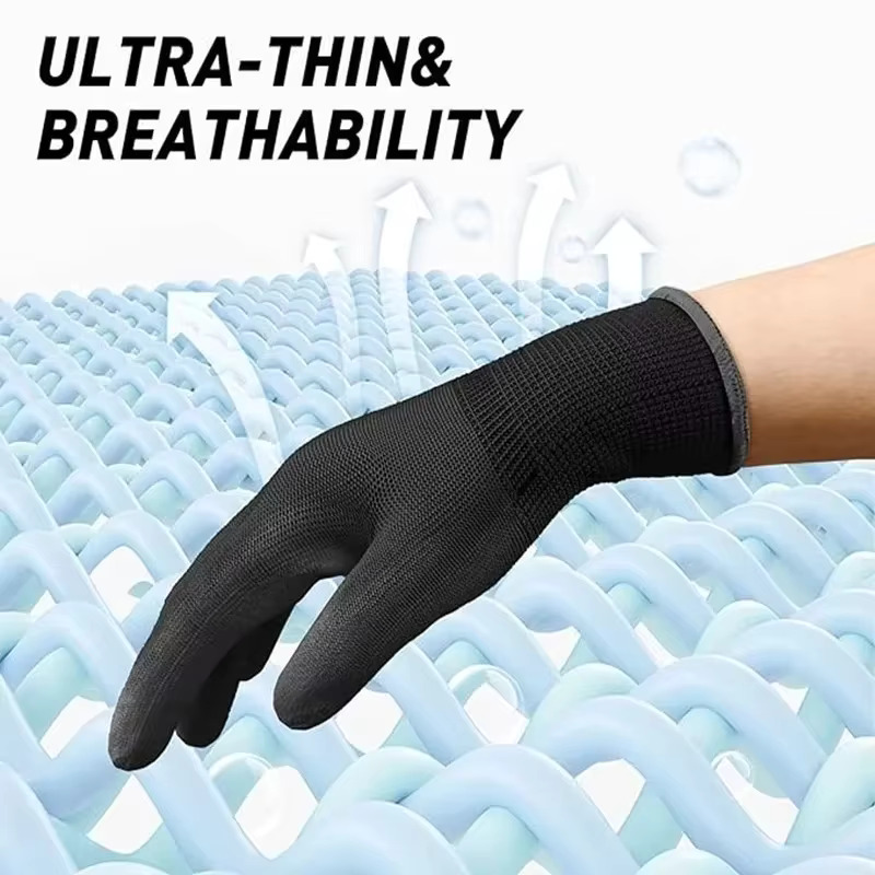 Black Nylon PU Coated Gloves Breathable Non Slip for Factory Machinery Gardening Woodworking Outdoor Safety Work Gloves